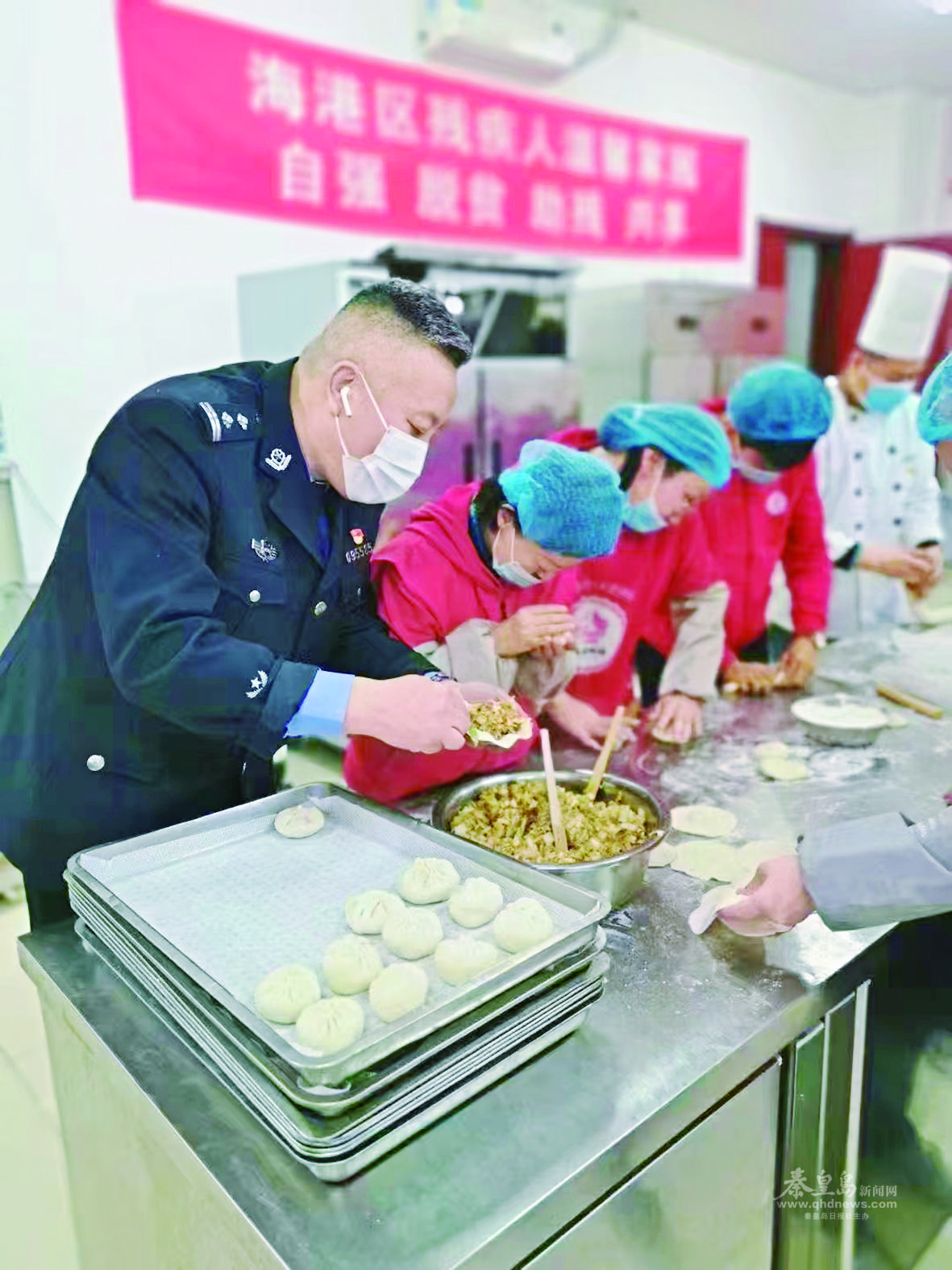 王寶軍(左一)陪伴天使烘焙的“天使”包包子。 (圖片由受訪者提供)