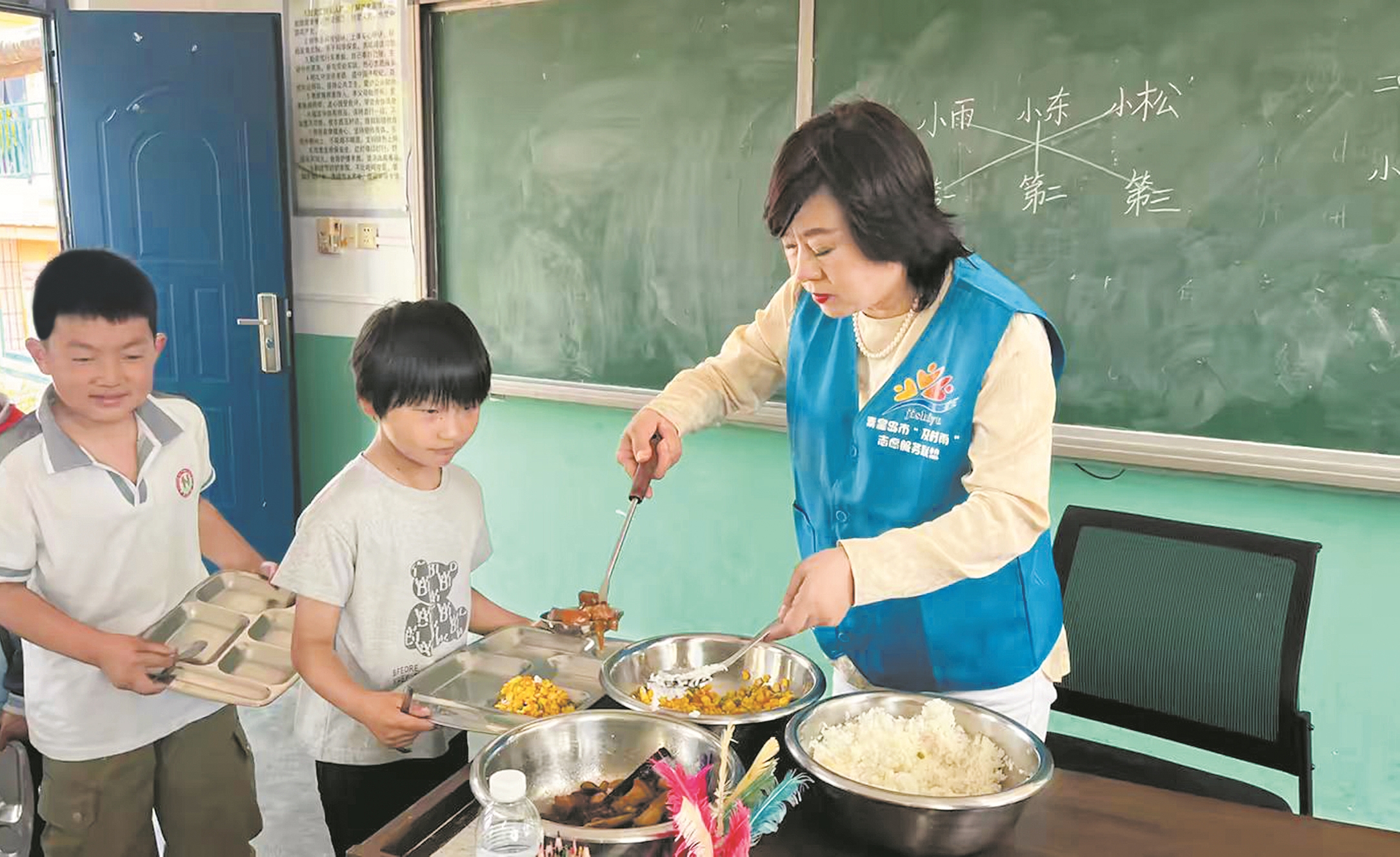 李秋杰在愛心廚房里為孩子們盛飯菜。(圖片由文苑百鑫志愿者服務(wù)隊提供)