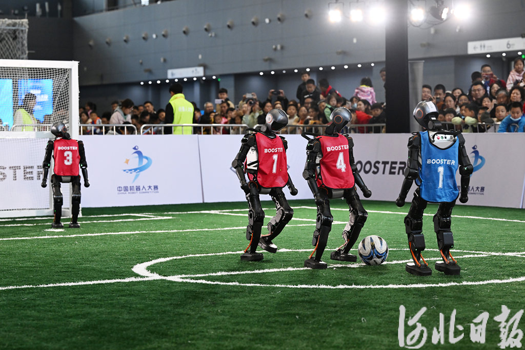 10月18日,3V3足球賽場上,人形機器人“球員”正在比賽。河北日報記者 史晟全 攝